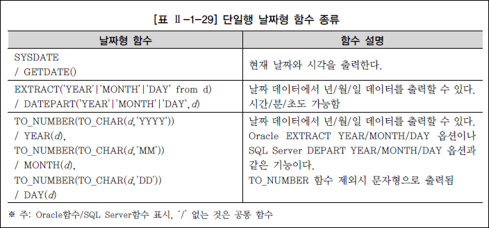 변환형 함수 - 명시적 데이터 유형 반환: 데이터 변환형 함수로 데이터 유형을 변환하도록 명시해주는 경우 - 암시적 데이터 유형 반환: 데이터베이스가 자동으로 데이터 유형을 반환하여 계산하는 경우 - 암시적 데이터 유형 반환의 경우 성능 저하가 발생할 수 있으며, 자동적으로 데이터베이스가 알아서 계산하지 않는 경우가 있어 에러를 발생할 수 있으므로 명시적인 데이터 유형 변환 방법을 사용하는 것이 바람직함 NULL의 특징 - 널 값은 아직 정의되지 않은 값으로 0 또는 공백과 다름 - 0은 숫자, 공백은 문자 - 테이블을 생성할 때 NOT NULL 또는 PROMARY KEY로 정의되지 않은 모든 데이터 유형은 NULL 값을 포함할 수 있음 - NULL 값을 포함하는 연산의 경우 결과 값도 NULL 값임 - 결과값을 NULL이 아닌 다른 값을 얻고자 할 때 NVL(Oracle)/ISNULL(SQLServer) 함수 사용 - NULL 값의 대상이 숫자 유형 데이터인 경우는 주로 0으로, 문자 유형 데이터인 경우는 공백보다는 'x' 같이 해당 시스템에서 의미 없는 문자로 바꾸는 경우가 많음