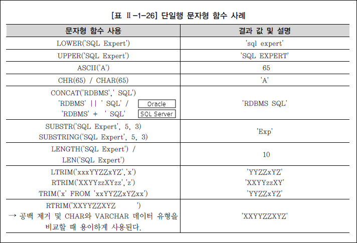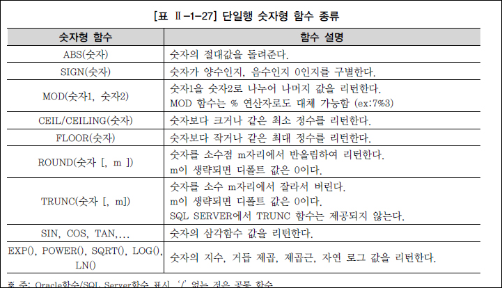 내장 함수 - SQL을 더욱 강력하게 해주고 데이터 값을 간편하게 조작하는데 사용 - 벤더별로 가장 큰 차이를 보이나, 핵심적인 기능들은 이름이나 표현법이 다르더라도 대부분의 데이터베이스가 공통적으로 제공 - 단일행 값이 입력되는 단일행 함수 - 여러 행의 값이 입력되는 다중행 함수 - 집계 함수, 그룹 함수, 윈도우 함수 단일행 함수의 특징 - SELECT, WHERE, ORDER BY 절에 사용 가능 - 각 행들에 대해 개별적으로 작용하여 데이터 값들을 조작하고, 각각의 행에 대한 조작 결과를 리턴 - 여러 인자를 입력해도 단 하나의 결과만 리턴 - 함수의 인자로 상수, 변수, 표현식이 사용 가능하고, 하나의 인수를 가지는 경우도 있지만 여러 개의 인수를 가질 수도 있음 - 특별한 경우가 아니면 함수의 인자로 함수를 사용하는 함수의 중첩 가능 DUAL 테이블 - 사용자 SYS가 소유하며 모든 사용자가 액세스 가능 - SELECT~FROM~의 형식을 갖추기 위한 일종의 DUMMY 테이블 - SQL Server의 경우 SELECT만으로도 SQL 문장 실행 가능(DUAL 필요X)