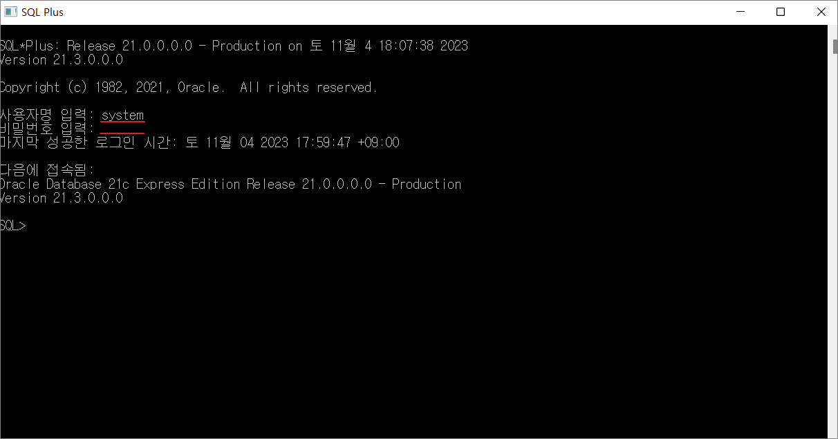 9. 접속 확인 - SQL Plus 접속 또는 CMDdp 'sqlplus'라고 작성 후 사용자명 'system'과 비밀번호 작성