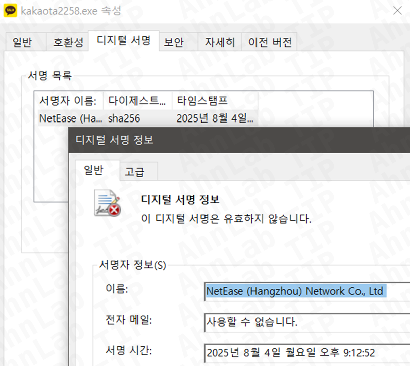 가짜 사이트에서 설치파일을 다운로드 할 경우 아래와 같이 카카오톡 이미지를 가진 악성코드가 다운로드된다. Kakao 社에서 공식으로 배포한 인증서가 아닌, 중국쪽 “NetEase”이름을 가진 유효하지 않은 인증서로 서명되어 있다.