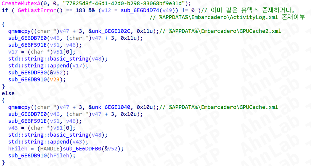두 조건이 모두 충족될 경우 %APPDATA%\Embarcadero\GPUCache2.xml 파일명의 ShellCode를 로드하며, 두 조건 중 하나라도 만족하지 않으면 %APPDATA%\Embarcadero\GPUCache.xml 파일명의 ShellCode를 로드한다.