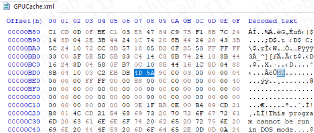 이때 로드되는 GPUCache(2).xml 파일은 0xE8(OPCODE: CALL) 로 시작하는 ShellCode이다. 암호화가 적용되지 않아 코드 그대로를 가지고 있으며, 내부에 또다른 실행파일(DLL)을 포함한 형태를 가지고 있다. ShellCode가 동작하면 해당 DLL 파일을 메모리상에 로드하여 실행한다.