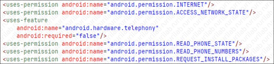 악성 앱이 요청하는 주요 권한은 android.permission.INTERNET(인터넷 접속), READ_PHONE_STATE(전화정보 읽기), READ_PHONE_NUMBERS(등록 전화번호 읽기), REQUEST_INSTALL_PACKAGES(외부 APK 설치)