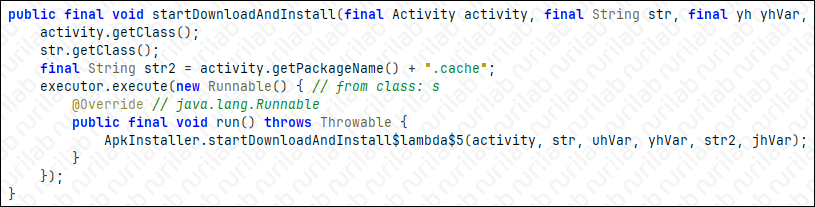 ▶ 이후, 전송 이후 추가적인 2차 페이로드 APK 다운로드하고 설치하는 악성 행위를 다음과 같이 수행하게 됩니다.