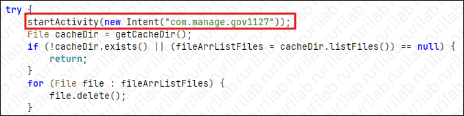 ▶ 앱에 주요 행위를 수행하는 코드 부분을 보면 우선 해당 피싱 앱에서 다른 앱을 실행하고자 하는 행위가 확인됩니다.